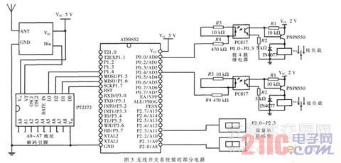 (2) 無線接收系統(tǒng)電路: 接收系統(tǒng)電路主要由接收模塊( 包括射頻模塊、芯片PT2272 及外圍電路) 、繼電器電路和負載電路組成, 如圖3 所示。PT2272 的1~8 腳是解碼地址端, 每個地址端可以設(shè)定“ 高電平” ( 該腳接5 V) 、“ 低電平” ( 該腳接地) 、“ 懸空” 三種狀態(tài), 該解碼地址的設(shè)定與PT2272 的地址編碼相對應(yīng)。當(dāng)射頻模塊接收到由發(fā)射電路發(fā)出的信號后,PT2272 進行地址碼比較核對( 解碼), 若地址碼核對正確, 則發(fā)射模塊TE 腳( 編碼啟動端用于多數(shù)據(jù)的編碼發(fā)射, 低電平有效) 發(fā)出的信號經(jīng)接射頻模塊由Din 腳(14 引腳) 進入PT2272 , 同時數(shù)據(jù)經(jīng)PT2272 的數(shù)據(jù)輸出腳D0~D3 (10~13 腳) 進入單片機; 反之PT2272 的數(shù)據(jù)輸出腳則無任何動作。當(dāng)信號進入單片機后, 單片機對其進行分析并作出相應(yīng)的控制。如果接收到的第一路信號為高電平, 單片機控制的數(shù)碼顯示管會顯示“11” ( 第一個“1” 表示第一路信號,第二個“1” 表示該信號為高電平) , 同時單片機向繼電器電路發(fā)出高電平, 繼電器吸合, 負載電路工作; 當(dāng)?shù)诙谓邮盏礁唠娖剑?通過單片機將對應(yīng)的端口電平置零;當(dāng)?shù)谌谓邮盏礁唠娖綍r再次置1, 如此循環(huán); 當(dāng)數(shù)碼管的顯示為“1 1” 時( 第一個1 表示第一路信號, 第二1 表示該信號為低電平) , 此時單片機向繼電器電路發(fā)出低電平, 繼電器斷開, 負載停止工作。利用繼電器和數(shù)碼管可以實現(xiàn)靈活控制并清晰地顯示。