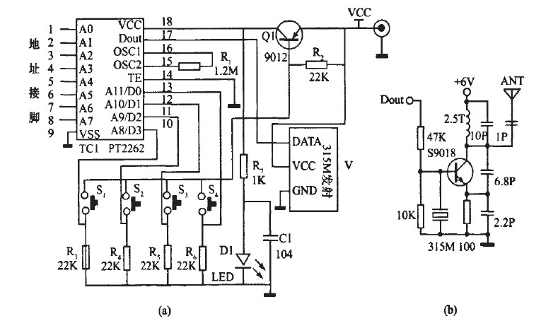該部分電路主要由315MHz無線數(shù)據(jù)發(fā)射模塊和編碼集成PT2262組成。該無線發(fā)射模塊原理圖如圖1中(b)所示,它具有較寬的工作電壓范圍3-12V,當(dāng)電壓變化時(shí)發(fā)射頻率基本不變,和發(fā)射模塊配套的接收模塊無需任何調(diào)整就能穩(wěn)定地接收。當(dāng)發(fā)射電壓為3V時(shí),空曠地傳輸距離約20-50m,發(fā)射功率較小;當(dāng)電壓5V時(shí)約100-200m)當(dāng)電壓9V時(shí)約300-500m;當(dāng)發(fā)射電壓為12V時(shí),為最佳工作電壓,具有較好的發(fā)射效果,發(fā)射電流約60毫安,空曠地傳輸距離700-800m,發(fā)射功率約500mW.當(dāng)電壓大于12V時(shí)功耗增大,有效發(fā)射功率不再明顯提高。發(fā)射模塊采用ASK方式調(diào)制,以降低功耗。當(dāng)數(shù)據(jù)信號(hào)停止時(shí)發(fā)射電流降為零,數(shù)據(jù)信號(hào)與DF發(fā)射模塊輸入端可以用電阻或者直接連接而不能用電容耦合,否則DF發(fā)射模塊將不能正常工作。數(shù)據(jù)電平應(yīng)接近DF數(shù)據(jù)模塊的實(shí)際工作電壓,以獲得較高的調(diào)制效果。
