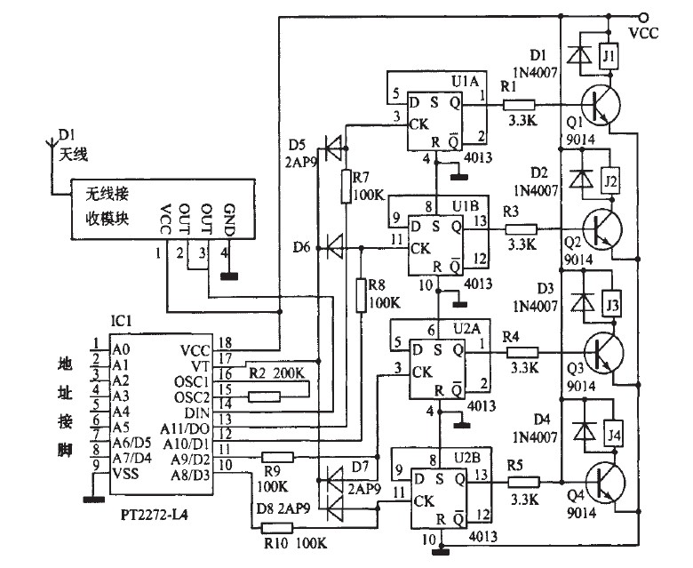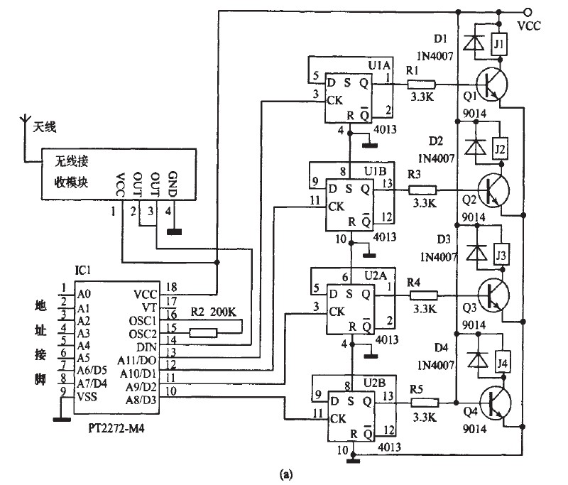 所以輸出接口在未解碼時(shí)就為低電平輸出了,即為非鏤狀態(tài)。所以如果將蠶2(a)中酶PT2272--M4改為Pr2272~L4,相應(yīng)的將原理網(wǎng)圖2(a)改為圖3,也能實(shí)現(xiàn)同樣的功能,即四路非鎖狀態(tài)。如果將某一路改為蠢錟狀態(tài),將耀應(yīng)的二極管去掉幫霹。鍘如,去掉D5,就將PT2272--L4的第13腳的非自鎖定輸出改為錟定輸出。