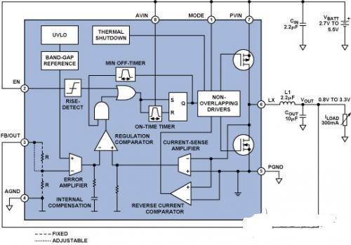 ADP2102高速同步開關(guān)轉(zhuǎn)換器在由2.7V~5.5V的電池電壓供電時(shí),可以使內(nèi)核電壓低到0.8 V.其恒定導(dǎo)通時(shí)間的電流模式控制以及3MHz開關(guān)頻率提供了優(yōu)良的動(dòng)態(tài)響應(yīng)、非常高的效率和出色的源調(diào)整率和負(fù)載調(diào)整率。較高的開關(guān)頻率允許系統(tǒng)使用超小型多層電感和陶瓷電容器。ADP2102采用3 mm×3 mm LFCSP封裝,節(jié)約了空間,僅需要三或四個(gè)外部元件。而且ADP2102包括完善的功能,諸如各種安全特征,如欠壓閉鎖、短路保護(hù)和過熱保護(hù)。