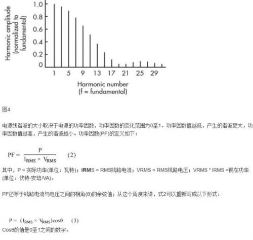 非線性負(fù)載可使諧波大小與線路頻率下的基本諧波電流具有可比性。圖4顯示了相對(duì)于線路頻率下的基本諧波大小進(jìn)行標(biāo)準(zhǔn)化的高階諧波電流大小。不過(guò),只有圖1中給出的在與線路頻率相同的頻率下且與電源線電壓同相的諧波電流(在此案例中為線路頻率下的基本諧波)對(duì)提供給負(fù)載的平均功率起作用。這些諧波電流會(huì)影響同一電力線上的其他設(shè)備的工作情況。
