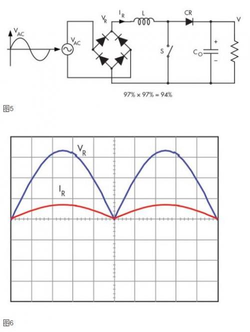 許多PFC電路都采用升壓轉(zhuǎn)換器。傳統(tǒng)的PFC升壓轉(zhuǎn)換器中的一個(gè)限制因素是它只能由整流后的交流電源線供電,而這種電源線涉及兩級(jí)功率處理(圖5)。轉(zhuǎn)換器產(chǎn)生的波形更好地說(shuō)明了這個(gè)問(wèn)題(圖6)。此外,無(wú)法通過(guò)簡(jiǎn)單有效的方法在傳統(tǒng)升壓轉(zhuǎn)換器中引入隔離。