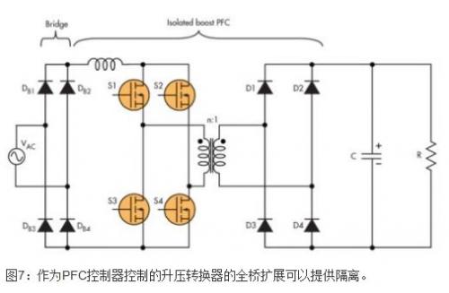采用升壓轉(zhuǎn)換器的全橋擴(kuò)展(然后作為PFC轉(zhuǎn)換器進(jìn)行控制)是一種引入隔離的方法(圖7)。不過(guò),這種方法需要在初級(jí)增加四個(gè)晶體管,在次級(jí)增加四個(gè)二極管整流器(晶體管和整流器均在100kHz的開(kāi)關(guān)頻率下工作),從而增加了復(fù)雜性。此外,四個(gè)增加的二極管位于以50/60Hz的線路頻率工作的輸入橋式整流器中。