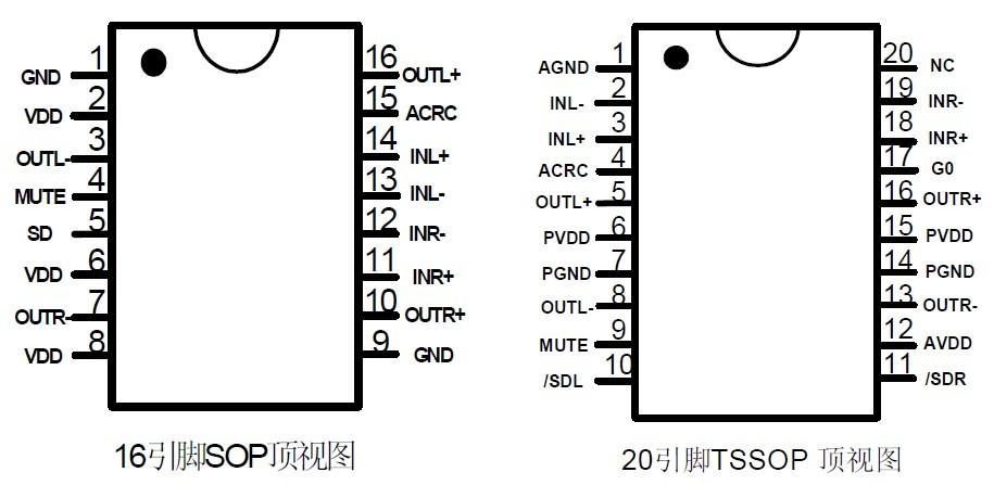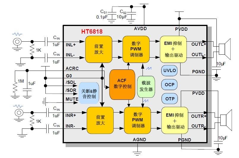 此外,HT6818內(nèi)置的關(guān)斷功能使待機(jī)電流最小化,還集成了靜音功能、左右聲道獨(dú)立關(guān)斷、揚(yáng)聲器輸出端過流保護(hù)、片內(nèi)過溫保護(hù)和欠壓異常保護(hù)等功能;采用無(wú)鉛TSSOP-20及SOP-16封裝形式。