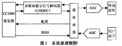 該系統(tǒng)的主體部分由微處理器(可以由實(shí)際應(yīng)用 選取不同的型號(hào))、收發(fā)器、解碼器、A/D與D/A轉(zhuǎn)換器構(gòu)成。以微處理器為核心控制用戶語(yǔ)音信號(hào)在傳送到無(wú)線電頻率前被采樣、數(shù)字化和被壓縮,接收到的信號(hào)解壓后再轉(zhuǎn)回模擬語(yǔ)音信號(hào)。