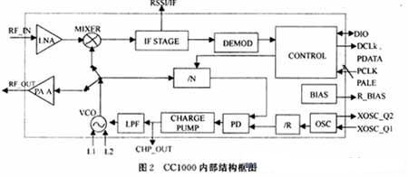 如圖2所示,CC1000內(nèi)部結(jié)構(gòu)顯示出構(gòu)成一個(gè)完整RF收發(fā)器的所有部件都集成在了芯片內(nèi)部,-109 dB的靈敏度與10 dBm的高輸出功率結(jié)合起來(lái),可以構(gòu)建提供長(zhǎng)而可靠的通信距離和電池工作電壓很低的系統(tǒng)。圖2中CC1000有一個(gè)能以250 Hz步長(zhǎng)進(jìn)行編程的集成鎖相環(huán)(PLL),可以對(duì)晶振的溫度漂移進(jìn)行補(bǔ)償,此外還提供了多信道系統(tǒng)和跳頻協(xié)議可供用戶在不同調(diào)整限制下的工作場(chǎng)合進(jìn)行選擇,以便在通信頻段擁擠時(shí)用來(lái)增強(qiáng)系統(tǒng)可靠性。最后,CC1000還提供了集成的位合成器與RSSI,且通過(guò)5根I/O線,可以很方便地與微處理器進(jìn)行接口。