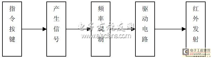 紅外線發(fā)射器由指令按鍵、信號(hào)產(chǎn)生電路、頻率調(diào)制電路、驅(qū)動(dòng)電路及紅外線發(fā)射器件組成,如圖1 所示。當(dāng)指令鍵按下時(shí),指令信號(hào)產(chǎn)生電路便產(chǎn)生所需要的控制指令信號(hào)。