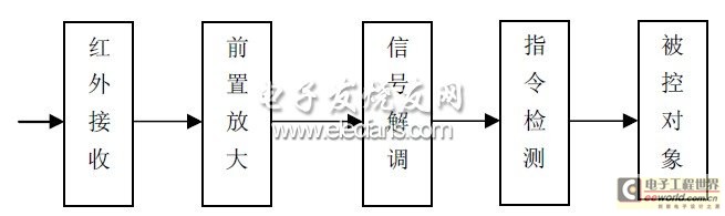 紅外接收器由紅外線接收器件、前置放大電路、信號(hào)解調(diào)電路、指令檢測(cè)電路組成,如圖2。當(dāng)紅外線接收器件接收到發(fā)射器的紅外線指令信號(hào)時(shí),它將紅外光信號(hào)變?yōu)殡娦盘?hào)并送入前置放大器進(jìn)行放大,再經(jīng)解調(diào)器解調(diào)后由指令信號(hào)檢出電路將指令信號(hào)檢出,實(shí)現(xiàn)各種操作。