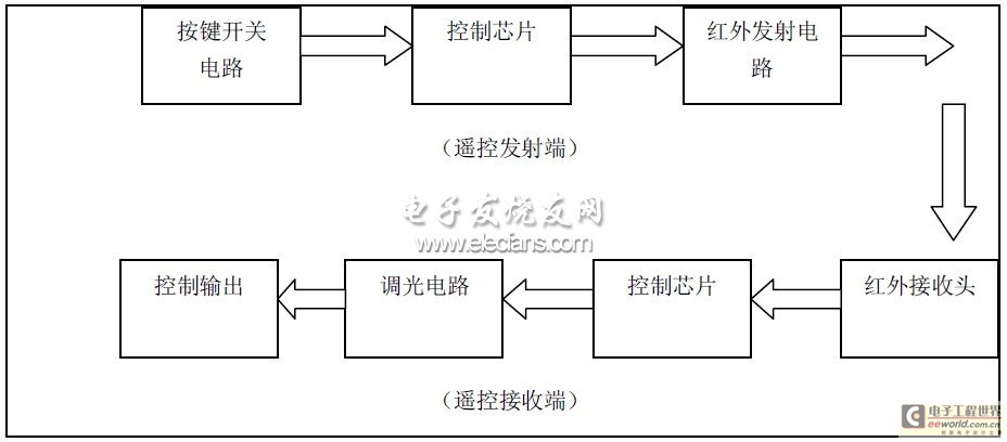 紅外遙控電路由發(fā)射電路和接收電路組成,發(fā)射部分由按鍵開關(guān)電路、控制芯片和紅外發(fā)射電路三部分組成。當(dāng)按下遙控按鈕時(shí),單片機(jī)產(chǎn)生相應(yīng)的控制信號(hào),經(jīng)紅外發(fā)射二極管發(fā)射出去。接收部分由紅外接收頭、控制芯片、調(diào)光電路組成,當(dāng)紅外接收器接收到控制脈沖后,經(jīng)單片機(jī)處理,判斷是否對(duì)電燈進(jìn)行調(diào)光或開關(guān),根據(jù)需要執(zhí)行相應(yīng)的操作,接收系統(tǒng)采用的是5 伏單電源電壓供電。如下圖所示: