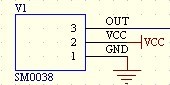 一般的紅外接收頭主要由集成電路外加阻容元件,紅外線接收管及濾波光片等組成,電路設(shè)計(jì)相對(duì)繁瑣,在實(shí)際應(yīng)用中不方便。而紅外遙控接收頭SM0038 集紅外接收管,前置放大解調(diào)等于一體,無外部電路,體積小,密封性好,靈敏度高,應(yīng)用簡單,用小功率紅外發(fā)射管發(fā)射信號(hào)接收距離達(dá)35 米,并且價(jià)格低廉。它僅有三條管腳,分別是電源正極、電源負(fù)極以及信號(hào)輸出端,其工作電壓在5V 左右,接收頻率為38kHz,它的主要功能包括放大,選頻,解調(diào)幾大部分,要求輸入信號(hào)需是已經(jīng)被調(diào)制的信號(hào)。從而使電路達(dá)到最簡化,靈敏度和抗干擾性都非常好,是一個(gè)接收紅外信號(hào)的理想裝置。如圖5 所示: