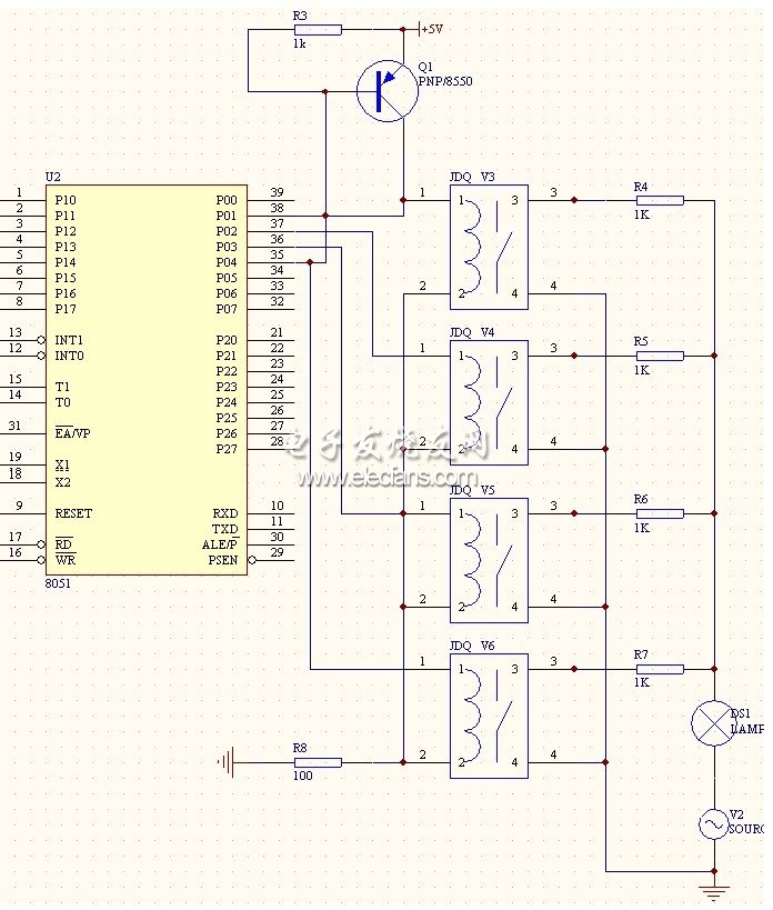 接收電路和調(diào)光電路的實(shí)現(xiàn)均是通過繼電器實(shí)現(xiàn)的,給每一個(gè)繼電器串聯(lián)一個(gè)電阻,構(gòu)成一個(gè)回路,本電路將四個(gè)繼電器回路并聯(lián),連接在P0 口上,當(dāng)四個(gè)繼電器均閉合時(shí),燈最亮,當(dāng)三個(gè)繼電器工作時(shí),燈較亮,當(dāng)兩個(gè)繼電器工作時(shí)燈次亮,當(dāng)一個(gè)繼電器工作時(shí),燈最暗,當(dāng)四個(gè)繼電器都不工作時(shí),燈泡處于關(guān)閉狀態(tài)。接收電路圖如圖6 所示:
