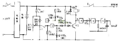R1,R2,RP1,RP3,門1.門2組成電池電壓檢測電路,其中,RP1調(diào)節(jié)電池放電終止電壓,RP2調(diào)節(jié)電池充電終止電壓。LED1(綠色),LED2(紅色)分別作充電終止指示和電終止指示。晶體管VT和繼電器J組成充放電自控開關(guān)電路。門4,門5和蜂鳴器等組成音頻脈沖振蕩器。當(dāng)電池電壓正常時,門1輸出高電平,門2輸出低電平,VD2導(dǎo)通,VT截止,J不動作,電池向負(fù)載正常供電。此時,LED1和LED2均不亮。由于VT截止,A點(diǎn)高電位,使門3輸出低是平,VD5導(dǎo)通,B點(diǎn)低電位,音頻脈沖振蕩器停振,蜂鳴器不發(fā)聲。電池充電監(jiān)視電路: