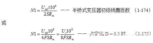 上面(1-174)和(1-175)式就是計(jì)算半橋式開(kāi)關(guān)電源變壓器初級(jí)線圈N1繞組匝數(shù)的公式。式中,N1為變壓器初級(jí)線圈N1繞組的最少匝數(shù),S為變壓器鐵心的導(dǎo)磁面積(單位:平方厘米),Bm為變壓器鐵心的最大磁感應(yīng)強(qiáng)度(單位:高斯);Uab為加到變壓器初級(jí)線圈N1繞組兩端的電壓,Uab =Ui/2 ,Ui為開(kāi)關(guān)電源的工作電壓,單位為伏;τ = Ton,為控制開(kāi)關(guān)的接通時(shí)間,簡(jiǎn)稱(chēng)脈沖寬度,或電源開(kāi)關(guān)管導(dǎo)通時(shí)間的寬度(單位:秒);
