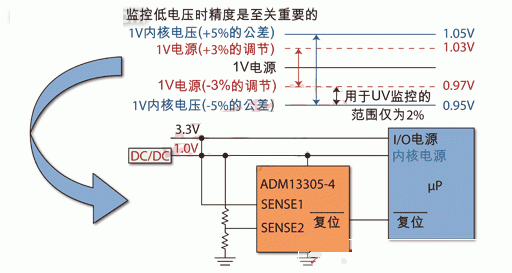 在這個(gè)例子中,1 V穩(wěn)壓電源實(shí)際的電壓范圍是0.97 V~1.03 V。微處理器可接受的核心電壓是1 V (±5%),即0.95 V~1.05 V。因此,欠壓監(jiān)控范圍為2%。而ADM13305、ADM13307與ADM1184的可調(diào)輸入在整個(gè)溫度范圍內(nèi)的精度高達(dá)±0.8%,電阻分壓器的精度為±0.1%,這使得欠壓電平監(jiān)控精度范圍能保持在2%以內(nèi)。