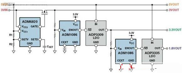 圖4所示的是如何使用電源時(shí)序控制器 ADM6820和ADM1086精確且可靠地對(duì)系統(tǒng)中的電源軌進(jìn)行時(shí)序控制。內(nèi)部比較器檢測電壓軌何時(shí)會(huì)超過精密的設(shè)定電平,經(jīng)過可編程的上電延遲之后,產(chǎn)生輸出,使線性穩(wěn)壓器ADP120和ADP130能按照期望的時(shí)序工作。閾值通過電阻比值來設(shè)定,延遲通過電容來設(shè)定。