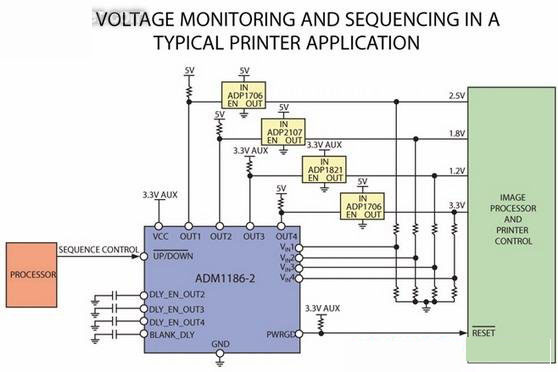 當(dāng)今的復(fù)雜系統(tǒng)往往需要多達(dá)四路電壓,并需要對(duì)低壓內(nèi)核電壓進(jìn)行更精確的監(jiān)控,還需要對(duì)電壓軌的上電與斷電時(shí)序進(jìn)行監(jiān)控。這些低壓需要被精確監(jiān)控,然后以正確的時(shí)序上電和斷電,同時(shí)確保每個(gè)電壓軌之間正確的延時(shí)。例如,如果電源電壓下降到閾值以下或者打印機(jī)ASIC中的電源沒有正確的上電或斷電,那么器件的工作將會(huì)出現(xiàn)異常,可能導(dǎo)致數(shù)據(jù)丟失。