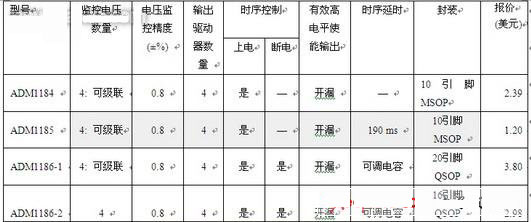 由于采用更低電源電壓的新工藝的發(fā)展,加上遺留的I/O電壓要求,近年來復(fù)雜系統(tǒng)中電壓軌的數(shù)量大幅增加。當(dāng)需要監(jiān)控多路電壓軌時(shí),可以使用能分別監(jiān)控兩路或三路電壓軌的多電壓監(jiān)控器,如ADM13305以及ADM13307。ADM6710與ADM1184還可以監(jiān)控四路電壓軌。ADM6710可提供預(yù)調(diào)電壓閾值,ADM1184可提供4個(gè)高精度(±0.8%)的可調(diào)輸入信號(hào),能夠利用外部電阻分壓器網(wǎng)絡(luò)設(shè)置跳變閾值。