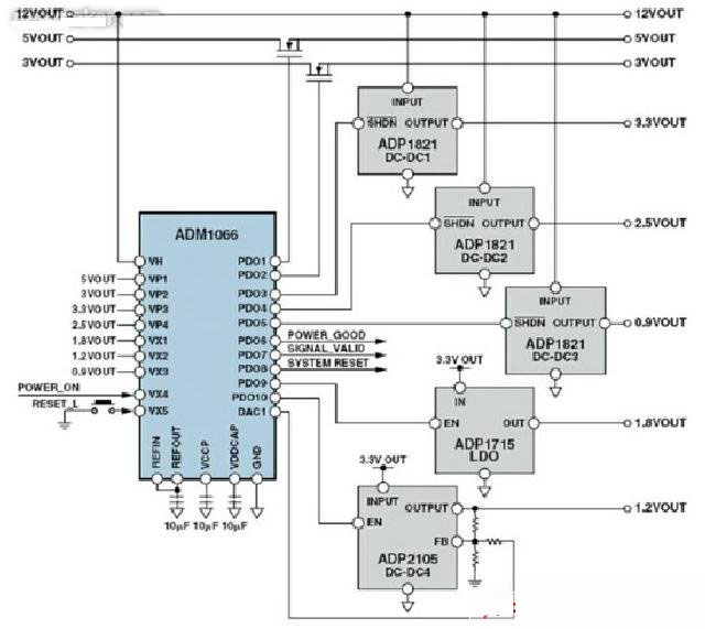 目前,許多高性能的IC都需要多路電壓。例如,提供獨(dú)立的內(nèi)核電壓和I/O電壓已成為許多器件的標(biāo)準(zhǔn)。在高端系統(tǒng)中,每個(gè)DSP器件會(huì)需要多達(dá)四個(gè)獨(dú)立的電源。而在更多情況下,單一系統(tǒng)中可能存在著大量的多電源器件,包括FPGA、ASIC、DSP、微處理器和微控制器(以及模擬器件)。