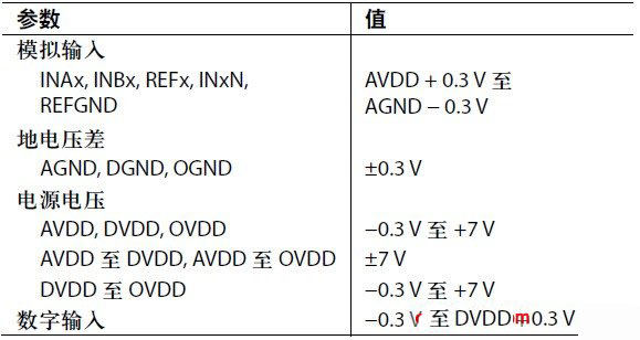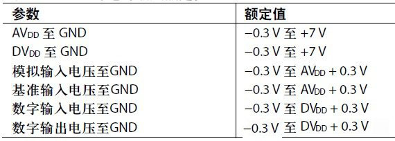 AD7794 ∑-△型24位ADC是另一個很好的例子。表3摘自AD7794 (Rev. D)數據手冊的"絕對最大額定值"部分。