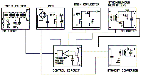 控制電路。半導體制造商最近以來一直在開發(fā)用于電源的集成化控制電路。這樣可以減少組件數量、降低制造成本并節(jié)省板空間,哪怕集成電路可能本身比離散組件更為昂貴。比如IR1150-這是一種PFC芯片,作為單循環(huán)控制(OCC)設備使用,可以在保持電源系統性能的同時大大減少元組件數量。同樣,可以通過特殊應用芯片來進行主轉換器電壓控制、過電流保護、過電壓保護和過溫度保護,并控制輸出整流器轉換。另外,還可以通過同步單啟動分源、借助邏輯控制來關閉電源的抑制電路、“電源狀態(tài)良好”信號、備用轉換器控制功能等控制渠道來提高應用的靈活性。當交流電源存在時,備用轉換器可以單獨提供5V的輸出。
