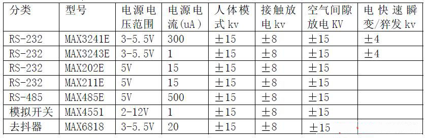 收的COM 端口需要8 個TransZorb?二極管費用高達$2一種有效的方法是采用內(nèi)部集成ESD 防護功能的串行接口器件這種器件比普通無防護功能的器件價格要貴但增加的費用比起外加防護二極管的費用要低內(nèi)部集成的ESD,防護電路不會增加任何輸入輸出管腳的等效電容也節(jié)省了電路板面積MAXIM公司近幾年發(fā)展了享有專利的集成ESD防護技術(shù)并可提供全系列的ESD防護串行接口器件包括與標(biāo)準(zhǔn)器件完全兼容的產(chǎn)品MAXIM公司還將同樣的技術(shù)應(yīng)用到模擬開關(guān)和開關(guān)去抖產(chǎn)品中所有這些器件的ESD 防護能力都符合15kV IEC1000-4-2 氣隙放電8kVIEC1000-4-2 接觸放電15kV人體模型HBM 測試標(biāo)準(zhǔn)下表是MAXIM公司具有抗靜電功能的器件。