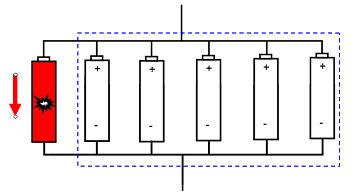 對于并聯(lián)的鋰離子動力電池模組,當(dāng)其中一節(jié)或幾節(jié)電池發(fā)生內(nèi)短時,電池模組中的其他電池會對其放電,電池組的能量會使內(nèi)短電池溫度急速升高,極易誘發(fā)熱失控,最終導(dǎo)致電池起火爆炸。如示意圖1所示