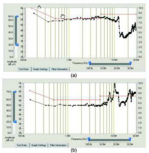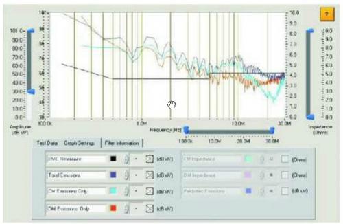 在標(biāo)準(zhǔn)電磁兼容性測試實(shí)驗(yàn)室可得到設(shè)備的總干擾情況,但無法了解設(shè)備的共模干擾和差模干擾特性。為了在測量中分辨共模或者差模干擾信號(hào),通用的儀器是很難實(shí)現(xiàn)的。使用專用的傳導(dǎo)測試儀,可獲得設(shè)備的總干擾、共模干擾和差模干擾。測試結(jié)果如圖3所示。