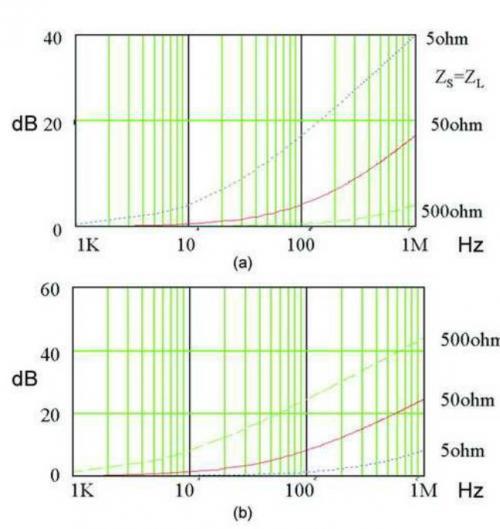上面的例子說明,選擇一個(gè)具有很高插損的濾波器也不能很好抑制傳導(dǎo)噪聲的原因是,電源輸入端阻抗的影響。因此,設(shè)計(jì)者除了選擇一個(gè)合適的濾波器之外,還需要了解電源的阻抗特性、共模阻抗和差模阻抗。阻抗測試可以借助專用的阻抗測試儀或者傳導(dǎo)分析儀。一種濾波器的共模阻抗(a)和差模阻抗(b)的變化如圖5所示。