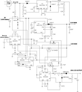 圖一電路為一完備的電源管理方案,適用于PDA、手持式盤點(diǎn)機(jī)、POS 機(jī)等中等功率便攜式設(shè)備。該方案中,輸入為一不穩(wěn)定的直流(墻上適配器或其它AC-DC 轉(zhuǎn)換器)或2 節(jié)AA 電池,輸出主電壓3.3V/500mA。電路中還包括一節(jié)鋰電池,當(dāng)墻上適配器或主電池電壓不起作用時(shí),鋰電池為RAM 提供3.3V 備用電源(3.3V RAM 點(diǎn))。升壓轉(zhuǎn)換器U4 輸出-20V/20mA, 為L(zhǎng)CD 供電。