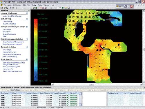 布線工程師、系統(tǒng)工程師、信號(hào)完整性工程師和電源設(shè)計(jì)工程師還可以將IR壓降分析結(jié)合在約束管理器(constraint manager)中,作為對(duì)PCB上每一個(gè)電源和地網(wǎng)表進(jìn)行設(shè)計(jì)規(guī)則核查的最終檢驗(yàn)工具(DRC)。這種通過自動(dòng)化軟件分析的設(shè)計(jì)流程可以避免靠目測(cè),甚至經(jīng)驗(yàn)所不能發(fā)現(xiàn)的復(fù)雜電源供電系統(tǒng)結(jié)構(gòu)上的布局布線問題。圖2展示了IR壓降分析可以準(zhǔn)確地指出一高性能PCB上電源供電系統(tǒng)中關(guān)鍵電壓電流的分布。