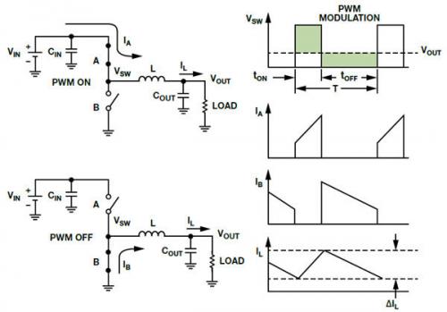 降壓穩(wěn)壓器對輸入電壓進行斬波,并通過LC濾波器傳送,以提供穩(wěn)定的輸出,如圖3所示。它使用兩個有源元件和兩個無源元件。有源元件是從輸入到電感的開關(guān)“A”,以及從地面到電感的開關(guān)(或二極管)“B”。無源元件是電感(L)和輸出電容(COUT)它們形成LC濾波器,可以減小由有源元件產(chǎn)生的紋波。