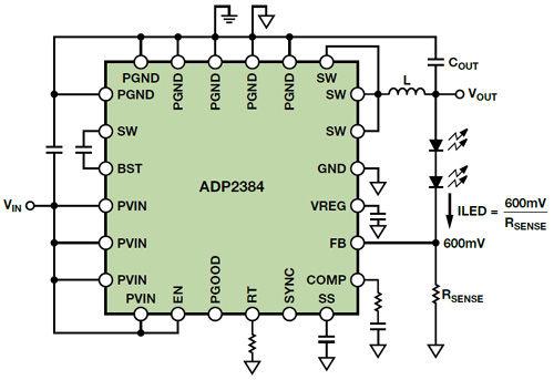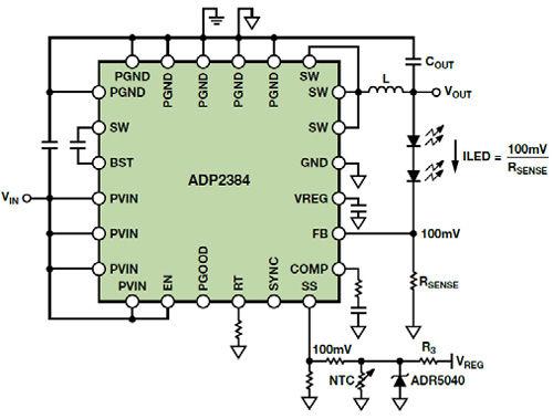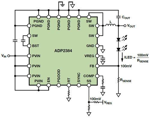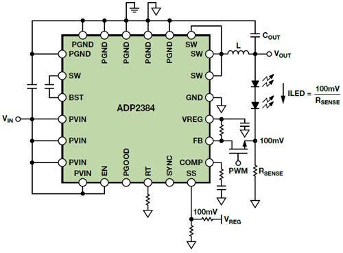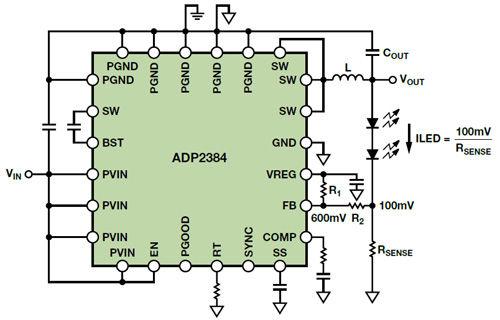 如果開關(guān)是內(nèi)部的,則降壓器稱為穩(wěn)壓器,如果開關(guān)是外部的,則稱為控制器。如果兩個開關(guān)都是晶體管(MOSFET或BJT),則它是同步的,如果底部的開關(guān)是使用二極管實施的,則它是異步的。這些類型的降壓電路各有優(yōu)劣,但同步降壓穩(wěn)壓器通?梢詢(yōu)化效率、器件數(shù)量、解決方案成本和電路板面積。遺憾的是,用于驅(qū)動高電流LED(高達4A)的同步降壓穩(wěn)壓器很少,而且成本昂貴。本文以ADP2384為例,展示如何修改標準同步降壓穩(wěn)壓器的連接以調(diào)節(jié)LED電流。