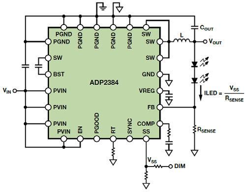 使用現(xiàn)成的降壓穩(wěn)壓器調(diào)節(jié)LED電流非常簡單。此處的示例采用了ADP2384。更加詳盡的論文還包括使用 ADP2441的示例,該器件的引腳較少,具有36 V輸入電壓范圍。該文顯示了一些示例,展示如何實施專用LED降壓穩(wěn)壓器提供的很多“智能”功能,例如LED短路/開路故障保護、RSENSE開路/短路故障保護、PWM調(diào)光、模擬調(diào)光和電流折返熱保護。我們在本文中將使用上例中的ADP2384,討論PWM和模擬調(diào)光、電流折返。