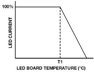 由于LED的使用壽命在很大程度上取決于其工作結(jié)溫,有時必須監(jiān)控LED溫度,如果溫度過高,必須做出響應。導致異常高溫的原因可能是散熱器連接不當、周邊溫度過熱或其他一些極端條件。常見解決方案是在當溫度超過某個閾值時減小LED電流(圖13)。這稱為LED 熱折返。