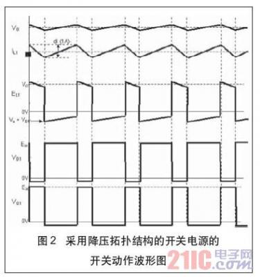 在達到預(yù)定的電壓或電流限值時,開關(guān)電源控制集成電路將開關(guān)斷開,從而使電感周圍的磁場衰減,并使偏置二極管D1正向?qū)ǎ瑥亩^續(xù)向輸出電路供給電流,直至開關(guān)再度接通。這一循環(huán)反復(fù)進行,而開關(guān)的次數(shù)由控制集成電路來確定,并將輸出電壓調(diào)控在要求的電壓值上。圖2所示為在若干個開關(guān)循環(huán)周期內(nèi),流過電感器和其它降壓拓撲電路元件上的電壓和電流波形。
