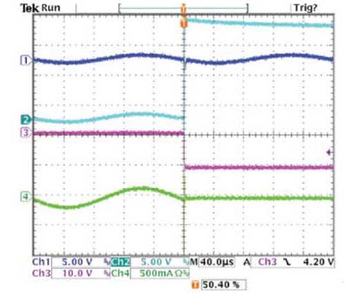 圖2的波形顯示了一個(gè)操作電路。放大器的輸出之一(軌跡1)是一個(gè)偏置2.5V直流1kHz的正弦波。軌跡2是線束信號(hào)。它開始也是一個(gè)偏置為2.5V,1kHz的正弦波,但在200µs時(shí),短接到一個(gè)18V電源上。軌跡3是分流調(diào)節(jié)器的輸出,最初偏置是11V,但被拉到地來(lái)響應(yīng)過壓狀態(tài)。軌跡4是線束的電流。起初為正弦波,該電流在響應(yīng)過載電壓時(shí)降至零。