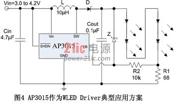 如果便攜式設備采用LCD作為彩色顯示屏,必然需要白色背光光源。在小尺寸顯示屏上通常用2顆~4顆白光LED作為背光。WLED一般工作在3.4V/20mA,4顆WLED所需的功率最大約為270mW.圖4即是由AP3015設計的WLED驅(qū)動電路,由單節(jié)鋰電池供電,根據(jù)LCD的尺寸,可在2~4顆內(nèi)調(diào)整WLED的個數(shù),同時可通過調(diào)整R1來調(diào)節(jié)WLED的電流。該電路的優(yōu)點在于每顆WLED的電流相同,能很好的保持亮度的均勻。該電路拓撲為升壓電路,負載為4個WLED,并和電阻R1共同構(gòu)成反饋環(huán)。