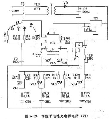 該鋅錳干電池充電器電路由電源輸入穩(wěn)壓電路、充電電路和定時控制電路組成,如圖5-124所示。