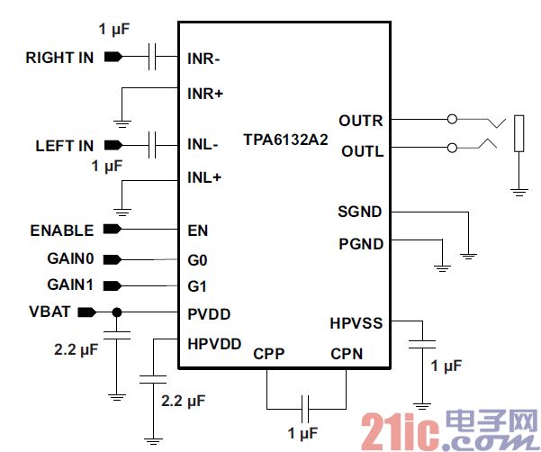 TI 提供的TPA6132A2,因為其100dB 的高信噪比,0.01%的低失真度,出色的消除POP 聲的能力,以及極高的性價比,在手機等移動設備中,得到了廣泛的應用。由于移動設備芯片的集成度的提高,越來越多的芯片組選擇了單端的連接方式作為耳機通道的輸出。