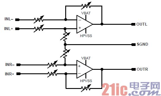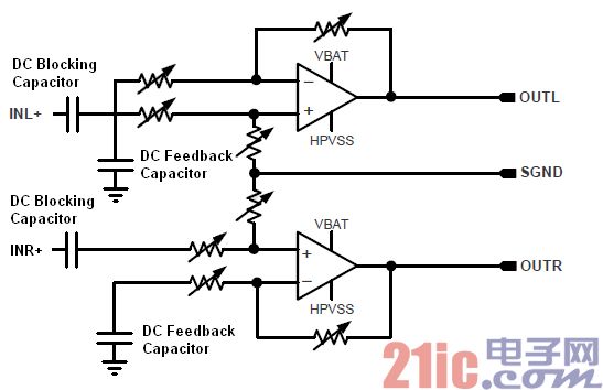 因為耳機對于放大器直流分量過于敏感,且HPVSS 并不完全對稱與VBAT,因此需要引入直流反饋來減小輸出的直流分量,因此需要將INL-和INR-通過一個直流反饋電容接地。而由于前端芯片輸出一般都有較高的直流分量,因此需要在INL+和INR+端接入隔直電容。