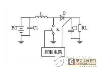 開(kāi)關(guān)K導(dǎo)通時(shí)電池BT給電感L充電,在L中以場(chǎng)的形式儲(chǔ)存能量1/(2L×I2)。其中,I為電感電流。K斷開(kāi)后,L中的磁能又以電能的形式釋放給濾波電容C2和負(fù)載RL.周期性的開(kāi)關(guān)操作使電池能量源源不斷地送入負(fù)載,而輸出電壓被轉(zhuǎn)換為:Vout = Vin/(1-δ)