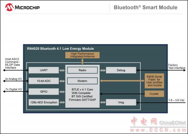 對于希望在任意設(shè)計中輕松添加這一低功耗連接功能的設(shè)計人員而言,Microchip的RN4020藍牙LE智能模塊包含一切所需的硬件、軟件和認證,并為通過QDID藍牙兼容性測試的最終產(chǎn)品清單(EPL)認證提供了便利。所有的可編程配置文件都存儲在模塊上,可供選用,包括Microchip靈活的MLDP文件和通用藍牙SIG低功耗配置文件。除通用公共配置文件之外,個人服務(wù)也可以通過ASCII命令接口來創(chuàng)建。RN4020還提供了一個發(fā)射功率為7 dBm、接收靈敏度為-92.5 dBm的內(nèi)置PCB天線,使模塊的有效工作距離超過100米*,而尺寸卻非常緊湊僅為11.5×19.5×2.5 mm。