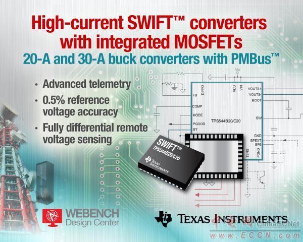 TI宣布推出業(yè)界首批具有 PMBus 接口的 18V、20A 及 30A 同步 DC/DC 降壓轉(zhuǎn)換器。該 SWIFT TPS544B20 及 TPS544C20 轉(zhuǎn)換器采用小型 QFN 封裝并支持集成型 MOSFET,可在空間有限的高功率密度應(yīng)用中驅(qū)動ASIC,能夠充分滿足有線及無線通信、企業(yè)與云計算以及數(shù)據(jù)存儲系統(tǒng)等不同市場的需求。這些轉(zhuǎn)換器與 TI 屢獲殊榮的 WEBENCH® 在線設(shè)計工具配合使用,可簡化電源轉(zhuǎn)換,加速電源設(shè)計進程。