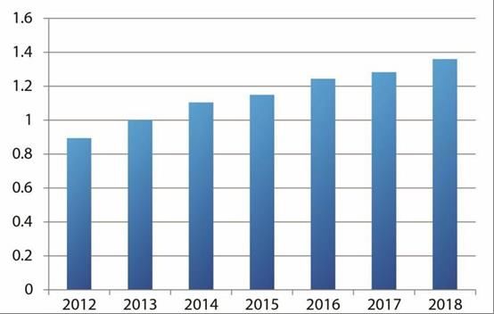 F1:車載電子元器件的電源IC銷售額示意圖(以2013年為“1”計算)