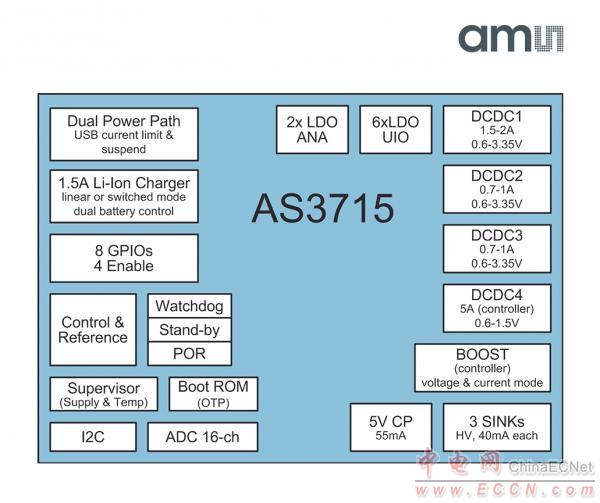 該設(shè)備還提供8個通用輸入輸出接口、1個支持1.5A輸出的充電器電路、1個I2C接口、3個電流阱、1個模擬-數(shù)字轉(zhuǎn)換器及一個監(jiān)視時鐘。