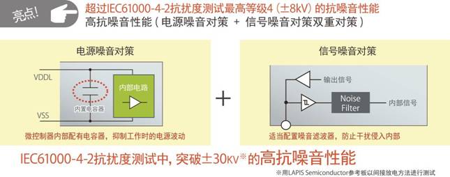 沿用8bit MCU ML610100系列的電路方式,在國際電工委員會(IEC)頒布的標(biāo)準(zhǔn)IEC61000-4-2的測試中,突破間接放電最高等級4(±8kV),成功達(dá)到測量極限±30kV。