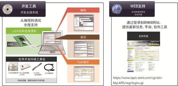 本LSI還具備完善的支持體制,備有可輕松開始評估的“ML620150家族”參考板和軟件開發(fā)環(huán)境。不僅如此,還設(shè)有 "用戶支持頁面" ,登錄LAPIS Semiconductor官方網(wǎng)站即可利用各種手冊和工具等。
