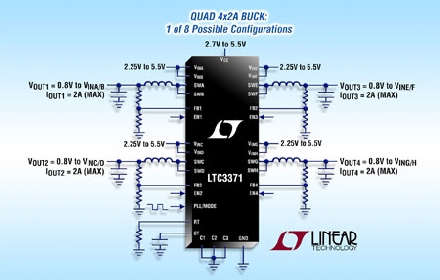 Linear推出高度集成的通用型電源管理解決方案 LTC3371,以用于需要多個低壓電源的系統(tǒng)。該器件具有四個同步降壓型轉(zhuǎn)換器,各由獨立的 2.25V 至 5.5V 輸入供電,而且均可通過配置以共享 8 個可用 1A 功率級中的最多 4 個。利用 8 種獨特的輸出電流配置,LTC3371提供了實質(zhì)的靈活性以及容易重復(fù)使用于不同應(yīng)用中。該器件是多種多通道工業(yè)、汽車、通信和分布式電源系統(tǒng)的理想選擇。