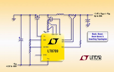 Linear推出適用于負至負或負至正 DC/DC 轉(zhuǎn)換的同步 PWM 控制器 LT8709。該器件無需復雜的電平轉(zhuǎn)換電路,就能夠獨特地解決相對于系統(tǒng)地的負電壓的調(diào)節(jié)問題。LT8709 的同步工作意味著,一個高效率 P 溝道 MOSFET 取代了輸出二極管,因此提高了效率,允許更大的輸出電流 (高達 20A),而且無需中到大功率應用通常所需的散熱器。LT8709 可配置為降壓、升壓、降壓-升壓和負輸出拓撲,從而使該器件高度通用以適用于多種電源設計。