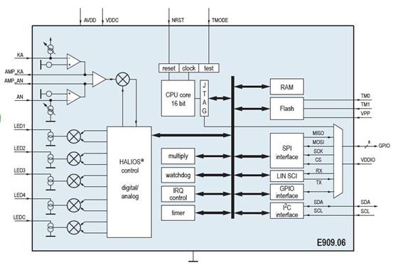 具體到方案的實(shí)現(xiàn)上主要通過兩款芯片E909.06及E909.07。E909.06是基于光電技術(shù)、內(nèi)置16位單片機(jī)的傳感器芯片。它能夠?qū)崿F(xiàn)非接觸式的手勢(shì)識(shí)別和制。而E909.07是一款高性能、高靈敏度的互阻抗放大器,它的引入入大大提高了E909.06的手勢(shì)識(shí)別的距離。采用elmos的手勢(shì)識(shí)別方案HALIOS™ 可以識(shí)別一維接近手勢(shì)、簡(jiǎn)單的二維和三維手勢(shì)的動(dòng)作。